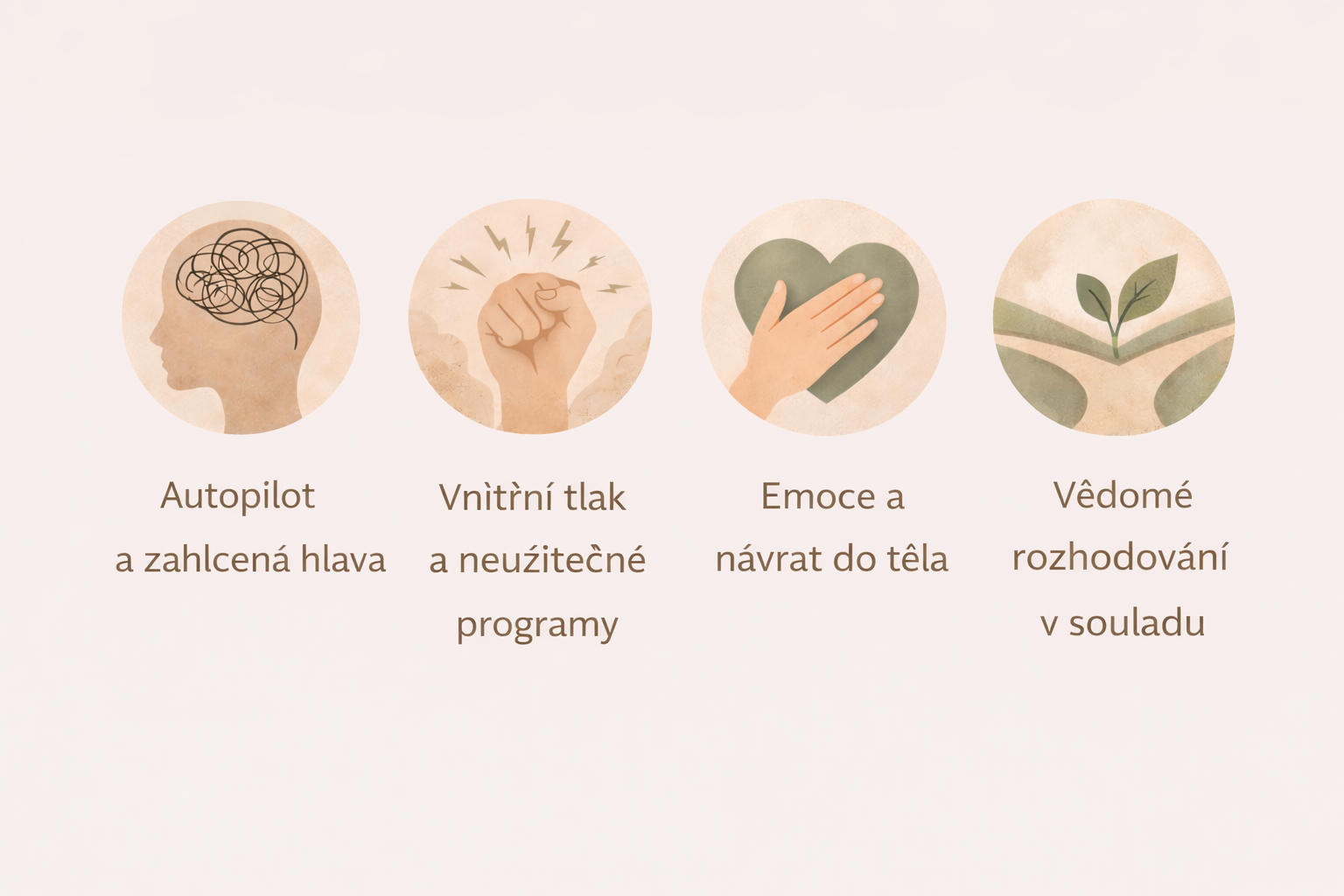 Je o tom, že se začneš víc orientovat v tom, co se děje uvnitř tebe a získáš konkrétní nástroje, jak se z autopilota vracet zpátky do těla a do přítomnosti.